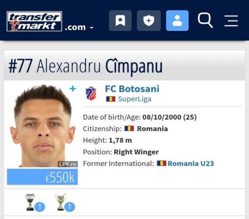 第三個,唯一花了租借費的第5名外援肯帕努,別看身價只有55萬歐,但他年輕啊,只有25歲,當年在羅馬尼亞U23是10號核心啊,本賽季羅甲博托沙尼19場貢獻5球2助攻,是隊內(nèi)第二射手,絕對好用啊。