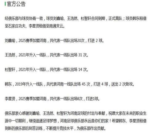 這番操作最亮眼的地方,在于俱樂部思路非常清晰,續(xù)約6名球員保住下限,引進(jìn)強(qiáng)力內(nèi)外援提升上限。另外,河南隊還官宣,劉鑫瑜、王浩然、杜智軒三名球員合同到期,正式離隊。球員韓東租借至中甲俱樂部石家莊功夫、李星賢租借至中甲俱樂部南通支云。