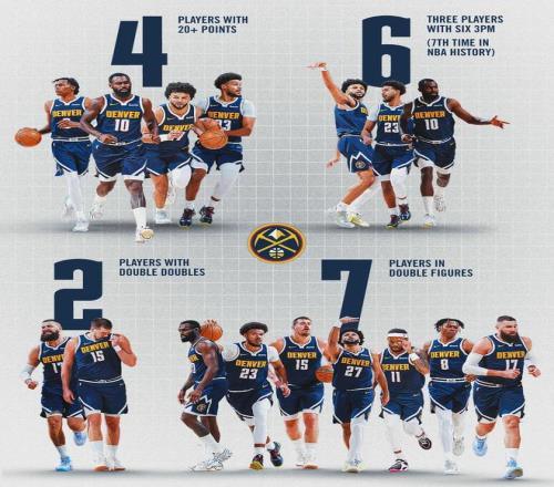掘金兩個(gè)首發(fā)缺陣:阿隆-戈登和佩頓-沃特森都沒(méi)打。本賽季掘金場(chǎng)均120.9分,高居聯(lián)盟第一;進(jìn)攻效率123.8,同樣是聯(lián)盟第一;投籃命中率49.6%,聯(lián)盟第二;三分命中率39.6%,聯(lián)盟第一;場(chǎng)均罰球命中數(shù)21.1,聯(lián)盟第二。