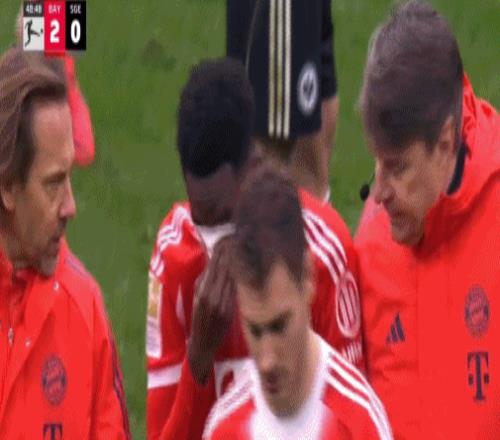 第23分鐘,阿方索-戴維斯倒地后被踩到腳踝,隨后有些痛苦