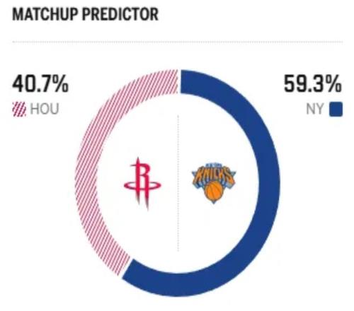 賽前,美媒ESPN對本場比賽進(jìn)行了勝率預(yù)測,火箭隊(duì)勝率僅有40.7% ,而尼克斯勝率則為59.3% ,稍占優(yōu)勢 。