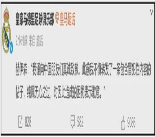目前,皇家馬德里足球俱樂部賬號分別在微博和某站發(fā)布了道歉動態(tài),內(nèi)容如下:
