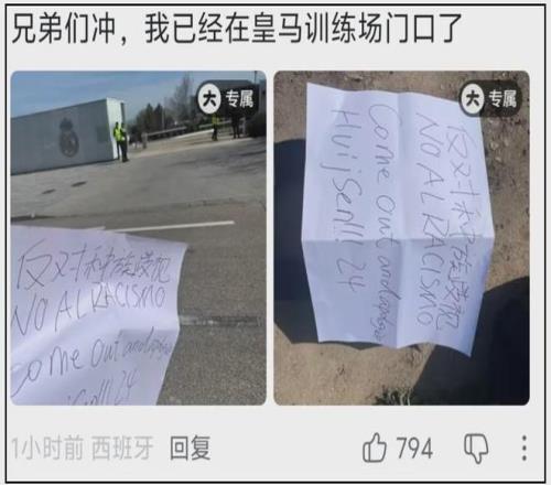 皇馬俱樂部某站賬號評論區(qū),就有IP定位西班牙的網(wǎng)友留言,他曬出了自制反歧視標(biāo)語,強調(diào)會前往皇馬訓(xùn)練場表達態(tài)度,從網(wǎng)友曬出的照片看,他真的去了現(xiàn)場,為網(wǎng)友執(zhí)行力點贊!
