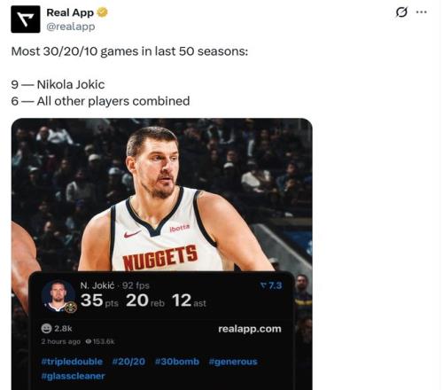 全場約基奇出戰(zhàn)36分鐘,21中11,三分4中3,拿下35分20板12助超級大三雙,外加3斷2帽,這是其生涯第9次單場至少拿下30分20板10助,斷層高居NBA近50年歷史第一,過去50年其他球員合計6次交出這一表現(xiàn)。
