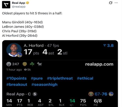 并且霍福德早早就進入比賽狀態(tài),半場三分6中5砍下賽季新高的17分,讓39歲264天的霍福德成為NBA歷史上半場命中至少5記三分第4老的球員。