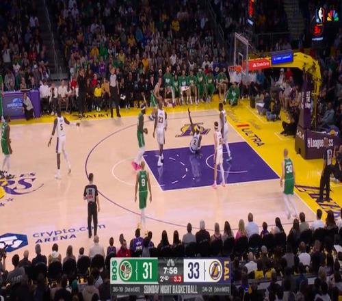 ——第二節(jié)開局1分半,進(jìn)攻時(shí)間快耗盡前,單挑八村壘,背運(yùn)后撤步,腳踩湖人LOGO的大號(hào)三分