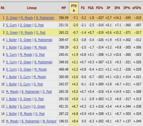 在勇士三人組中,追夢、波杰、穆迪的組合一起出戰(zhàn)將近357分鐘,這一時長排名隊內(nèi)第四(前三的三人組中至少有庫里和巴特勒其中一人),但三人同時在場時,勇士每百回合要凈負(fù)7.1分,在隊內(nèi)斷層式墊底。