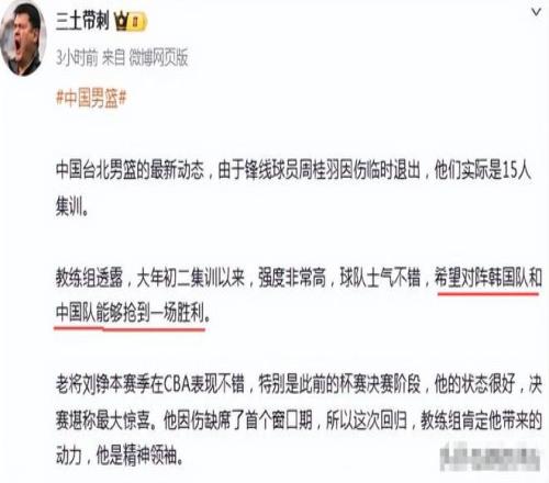 開戰(zhàn)之前,臺北隊也說了一些豪言,陳盈駿接受采訪時表示:“上個階段連輸兩場對我們來說比較落后,所以這兩場我們會全力搶勝?!睋蟮溃袊_北隊,由于鋒線球員周桂羽因傷臨時退出,他們實際是15人集訓。教練組透露,大年初二就開始集訓,而且強度非常高,球隊士氣不錯。在展望第二窗口期的比賽時,臺北教練組說,希望對陣韓國隊和中國隊能夠搶到一場勝利。中國隊得小心了,如果戰(zhàn)術不得當,發(fā)揮失常的話,也有陰溝翻船的可能。
