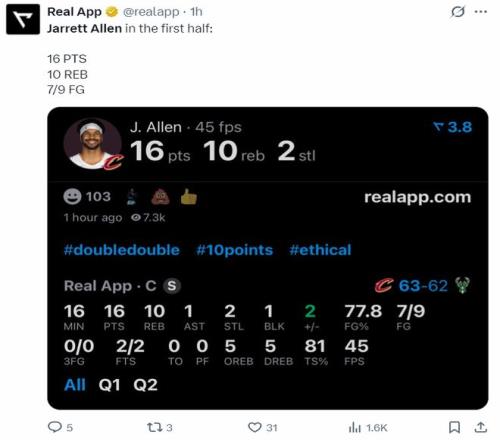 這導(dǎo)致整個下半場阿倫只有1個籃板球進(jìn)賬,全場比賽32分鐘,15中10,罰球8中7,拿到27分11籃板1助攻2搶斷1蓋帽,命中率66.7%,真實命中率72.9%,正負(fù)值-10。雖然沒有騎士三巨頭阿倫依舊拿到了爆炸的兩雙數(shù)據(jù)。
