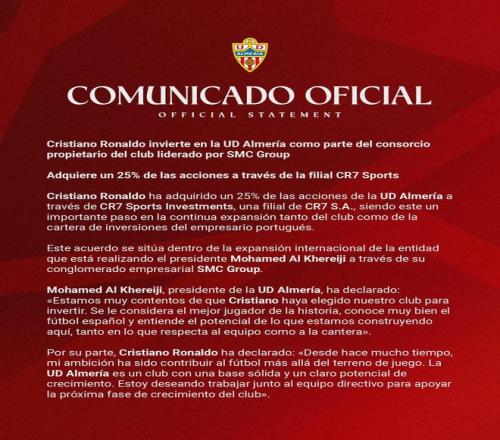C羅宣布收購(gòu)了阿爾梅里亞25%的股份,成為了俱樂(lè)部的股東之一,從目前的消息來(lái)看,C羅應(yīng)該是不會(huì)參與到俱樂(lè)部的實(shí)際運(yùn)營(yíng)當(dāng)中,他更多是暫時(shí)以一個(gè)投資者的身份進(jìn)行的收購(gòu),不過(guò)關(guān)于C羅的投資細(xì)節(jié)以及投資的金額并沒(méi)有太多的信息。阿爾梅里亞這支球隊(duì)關(guān)注西甲的球迷還是非常熟悉的,他們算是比較有名的西甲升降機(jī),多次升入西甲聯(lián)賽但是也多次降級(jí)。