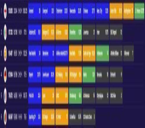 歐戰(zhàn)前六聯(lián)賽本賽季歐戰(zhàn)生存狀態(tài),藍(lán)色為歐冠,黃色為歐聯(lián),綠色為歐協(xié),黑色為出局。